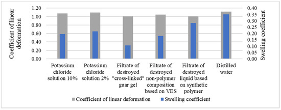 Some hydrocarbon reservoirs are characterized by the presence of clay minerals. The penetration of fresh water as part of HF fluid into such reservoirs during various technological operations can lead to swelling of clay minerals, a decrease in permeability and, as a consequence, a decrease in the efficiency of the work performed [54,57,58,59]. As a result, one of the important parameters of the quality of the HF fluid is its effect on the water-sensitive areas of the reservoir. There is a long list of methods used to study the swelling of clays, but there is an acute issue related to the interpretation of the obtained experimental data and their extrapolation to the real conditions of the reservoir.