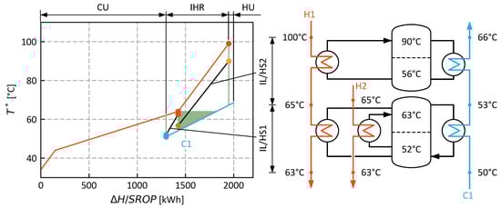 The HP potential of the obtained solution in terms of condenser capacity is approximately 6500 kWh/day. The resulting ISSP with the HPTES solution contains two ILs. Figure 17 shows the schematics of the combined IHR and HPTES system (Variant 4).