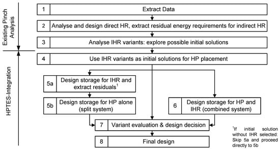 This work aims to extend the ISSP method for the integration of HPs in combination with TES (HPTES system) into non-continuous processes in order to improve energy efficiency. There is currently a gap in the literature in that there is no method to evaluate the integration of HPs combined with IHR systems or separate from them. Theoretically, TES requirements can be reduced in a combined HP and IHR system. However, with a separate HP system the HP is less interconnected with the processes and may be more robust in operation. The novelties introduced in this paper are:
