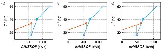 where is the overall heat transfer coefficient between the IL fluid and the process stream and is the duration of the stream in the TSM. The variable is a proportionality constant that is determined beforehand based on a user-specified minimum overall temperature difference, . The y-exponent influences the magnitude of temperature shifting. Once an individual stream’s contribution is determined, it is either subtracted from the stream supply or added to the target temperature. The ISSP can then be constructed in a composite manner using the new shifted stream temperatures. The ISSP identifies the maximum potential of possible IHR and shows the amount of residual heat loads above and below the Pinch present, which may be used for HP integration after the extent of IHR is determined. Figure 3 shows ISSPs with three different extents of overlap: 0 kWh (i.e., no IHR), IHR of 80 kWh, and IHR of 140 kWh (all with ). The user has to select the extent of overlap as the initial solution for HP integration in Step 4.