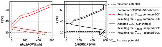 Because of the aforementioned challenges, we propose the calculation of an adapted GCC of the ISSP. While the CCs are shifted when calculating the GCC for continuous processes, the adapted GCC for the ISSP is calculated without temperature shifting of the ISSP. This is possible because the ISSP is already shifted during its generation. Figure 5 shows the difference in the potential real HP condensation temperature reduction and evaporation temperature increase between the calculation of the GCC with (red lines) and without (black lines) shifting of the ISSP.