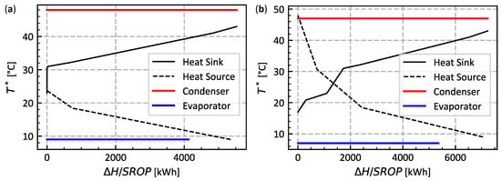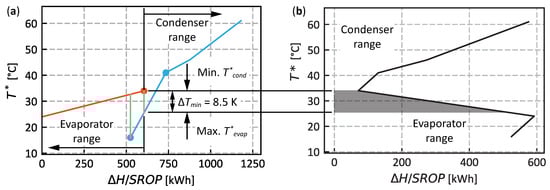 Without the temperature shifting of the ISSP in the adapted GCC calculation, however, it is necessary to impose limits to allow the HP to operate across the Pinch. The evaporator must extract heat from the subsystem below the Pinch and the condenser must add heat to the subsystem above the Pinch. To achieve this, temperature limits on the shifted evaporation and condensation temperatures are required, as illustrated in Figure 6a. These limits are the temperatures of the source and the sink profile at the Pinch. The temperature limits in the adapted GCC are shown as the shaded area between the minimum condensation and maximum evaporation temperature (Figure 6b). The evaporator () has to be placed below this area, and the condenser () above this area.