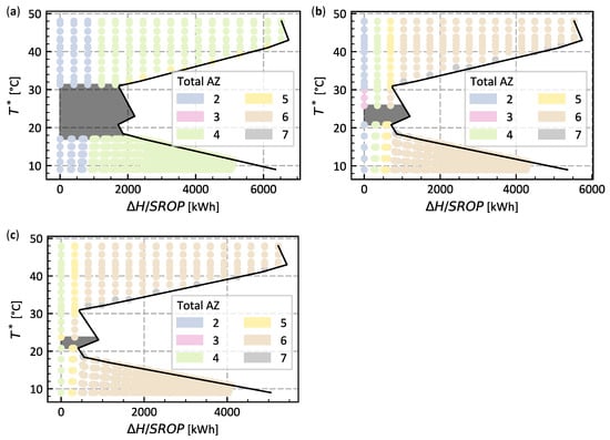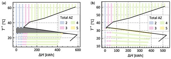 The integration of the HP often leads to the requirement of additional AZs. Every additional AZ should be understood as an increase in the complexity of the system, as additional volume storage units (VSUs, ref. [26]) are required. A VSU typically represents a temperature layer in the storage system. This work only considers stratified storage with two layers. As the integration of an HP changes the topology of the system, different placements can lead to different numbers of AZs. To support the placement of the HP, an enumeration of the feasible HP placement options is performed. This enumeration evaluates the resulting number of AZs if an HP is placed in one of the feasible regions in the adapted GCC (Figure 6b). The AZ algorithm [29] is applied in a brute force approach. This brute force enumeration evaluates HP placement options starting from the condenser placement. The corresponding feasible evaporation temperatures are evaluated for each condenser placement. The HP characteristics are calculated according to Equation (2). The result of this procedure is shown in Figure 7a,b for the 80 kWh IHR overlap and 140 kWh IHR overlap variants, respectively. The adapted GCC includes the restricted area, which, as shown in Figure 7b, is small due to the small remaining temperature difference between the ISSP at 140 kWh IHR overlap.
