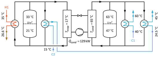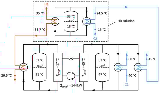 After taking the residuals of the streams from the IHR, the potential HP condenser capacity according to the inverted residual ISSP (Figure 4b) is 575 kWh/batch, a 48 K temperature increase. For a split IHR and HPTES (Steps 5a and 5b) with an IHR overlap of 80 kWh, the resulting design (Variant 2) is shown in Figure 8. Three storage tanks are implemented, and the IHR storage on top is used to preheat C2 and cool H1. The HP is embedded between the two lower storage units, which are used to balance out the temporal imbalance between of the heating and cooling requirements and the continuously operating HP.