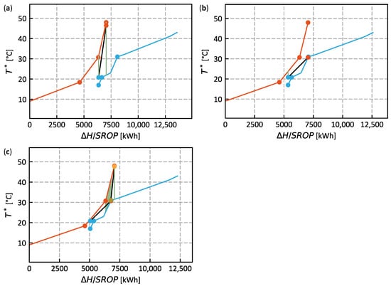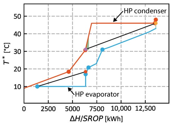 Based on the inverted residual ISSP in Figure 12a, a shifted condenser temperature of approximately 48 °C and shifted evaporator temperature of 9 °C were selected. Based on this, the HPTES design for this HP placement (Variant 2) is shown in Figure 13.