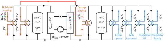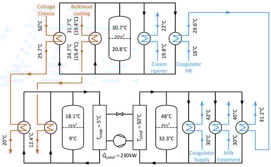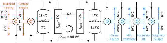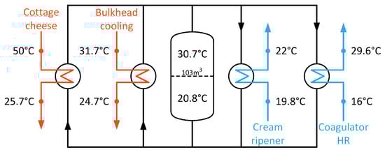 Comparing Figure 14 with Figure 13, a simpler system can be obtained using two storage units which are bigger; in this system, there is no interlinking of the storages through the process streams. The same two hot streams discharge to the evaporator side of the HP, and the HP increases the temperature level to provide all the heating. The drawback of this is a larger HP with 301 kW condenser duty. Based on the number of TES and the absence of interlinking storages, the user may prefer this implementation due to its reduced complexity. However, the temperature range of the cottage cheese washing water, beginning at 50 °C, can be exploited through IHR in a combined system.