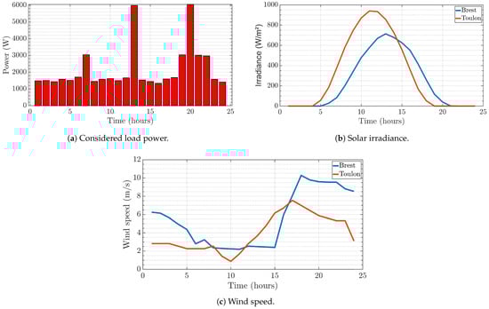 A home microgrid, which implements the V 2 H concept, is designed for the relief of main grid constraints. The MG is operated in grid-connected mode and consists of PV, WT, battery energy storage, and an EV. The architecture of the MG is presented in Figure 1. All components are linked to the DC bus through D C / D C converters (PV, batteries, and EV) or A C / D C converters (WT and grid). The PV and WT produce a quantity of energy depending on weather conditions, which does not always match the load demand. There are two possible scenarios: energy production is insufficient or, conversely, there is surplus energy generation. Energy storage and the main grid allow for the buffering of insufficient or excess power generation. Indeed, the battery and grid can restore the production/consumption balance by supplying the lack of energy or, conversely, by absorbing excess energy. Since the energy absorbed/fed by the battery is limited by its SOC and its maximum power, and since grid power can also limited, an EV can be used as an additional backup energy storage. Indeed, an EV can be charged through public charging stations or when parked at home. In order to support the grid and ensure the continuity of electricity supply, it can have a bidirectional energy exchange with the home MG.