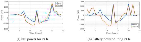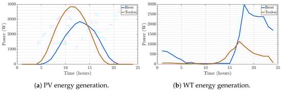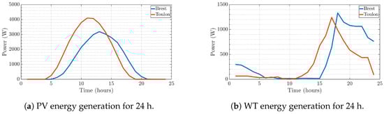The power generated by the PV panels depends on the installed maximum power and weather conditions. The PV output power depends on the irradiance, the efficiency of the generation, the area of the panels and the optimal orientation depending on the location. The chosen PV technology has an efficiency η p v = 15 % . The power produced by PV over a day is given as follows: