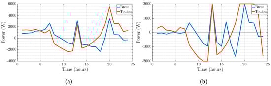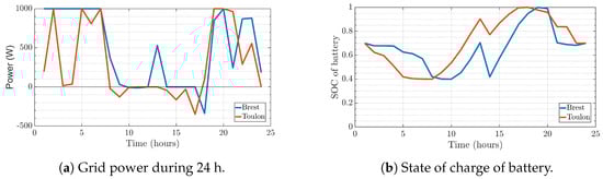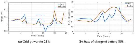 Equations (14) and (15) are set to ensure that the battery and EV battery recover its initial state of charge at the end of each day. To ensure this, the battery and EV provide a quantity of energy during underproduction periods, which is recovered during overproduction periods. Since the EV is not available all the day, it can be used only for a certain period of the day as specified by Equation (16). Finally, the power supplied (absorbed) by the battery is limited because of the characteristics of the conductors and switches, as shown by Equation (17). In addition of that, grid power should be limited to increase autonomy and avoid overloading. Its power is limited between minimum and maximum values as depicted by Equation (18).