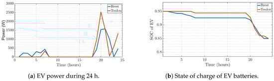 The energy supplied by the battery and the EV depend on their capacity and their state of charge (SOC). Moreover, the output power is limited to enhance the lifespan of energy storage devices. The SOC represents the ratio between the energy contained in the battery (respectively, EV battery) and its maximum capacity (respectively, EV battery capacity). The SOC of the battery (respectively, EV battery) depends on the power supplied or recovered by the battery (respectively, EV battery), the time of application of this power ( δ t = 1 h), and its maximum capacity (respectively, EV battery capacity). The SOC varies from one hour to another and can increase during charging and decrease during discharging. The SOC for both the battery and the EV battery is given by the following formula: