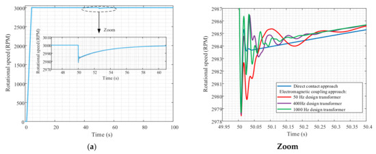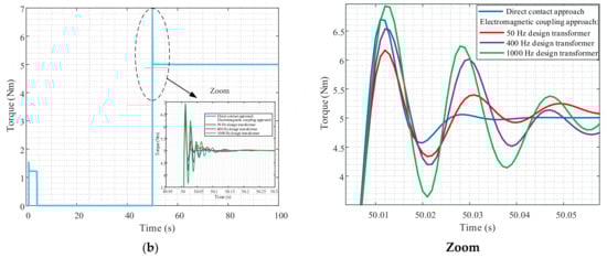 - The usage of the rotary transformer instead of direct contact degrades the dynamic performance of the EESM by less than 5.38% in the case of 400 Hz design of the rotary transformer. Further improvement of the dynamic response of the EESM with rotary transformer can be achieved with the proper adjustment of the PI controllers’ gains of the control system. The future work towards improvement of the EESM dynamic response can also include the advanced optimization procedure for tuning the PI gains of the model controllers including the automatic recalculation of the geometry of the rotary transformer based on the rotary transformers’ time constant as an optimization goal. These results may have an important contribution in the field of the development of the power electronics required for the excitation circuits of the EESM.