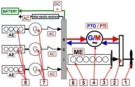 Example of the main propulsion system of the vessel: 1. Unregulated pitch drive screw propeller (fixed pitch propellers—FPP); 2. Electricity generator gearbox; 3. Clutch disconnector; 4. Shafted alternator (PTO/PTI); 5. Marine low-speed, two-stroke main engine (ME); 6. RCI main power unit (AC/DC rectifier, AC/AC converter, DC/AC inverter); 7. Auxiliary engine (AE)—driven generators (G); 8. Auxiliary engine (AE) driving generators of ship power plants.