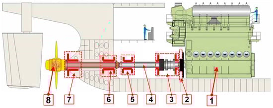 Sample diagram of the main propulsion system of the ship: 1—marine low-speed, two-stroke internal combustion main engine (ME), winged and slow-running; 2—non-disconnectable hydraulic coupling; 3—thrust bearing; 4—intermediate shaft; 5—bearing of intermediate shaft; 6—bearing of screw shaft; 7—scabbard of screw shaft; 8—fixed pitch propeller (own elaboration using MAN BW drive drawing [30]).