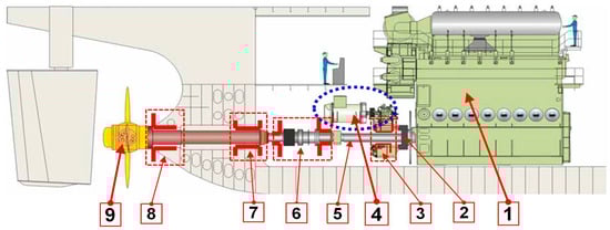 Example of ship’s main propulsion with shaft generator and PTO/PTI system: 1—marine low-speed, two-stroke diesel engine—main engine (ME); 2—hydraulic separable coupling; 3—shaft generator gear; 4—shaft generator (PTO/PTI); 5—intermediate shaft; 6—thrust bearing of intermediate shaft; 7—bearing of screw shaft; 8—stern tube; 9—fixed pitch propeller (own elaboration using MAN drawing [30]).