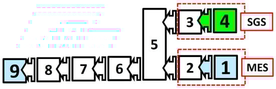 Scheme of main propulsion of the ship with shaft generator and PTO/PTI system: 1—two-stroke main motor; 2—hydraulic coupling; 3—shaft generator gear; 4—shaft generator (PTO/PTI); 5—intermediate shaft; 6—thrust bearing of intermediate shaft; 7—bearing of screw shaft; 8—stern tube; 9.—fixed pitch propeller; SGS—shaft generator systems; MES—main engine set (own elaboration).