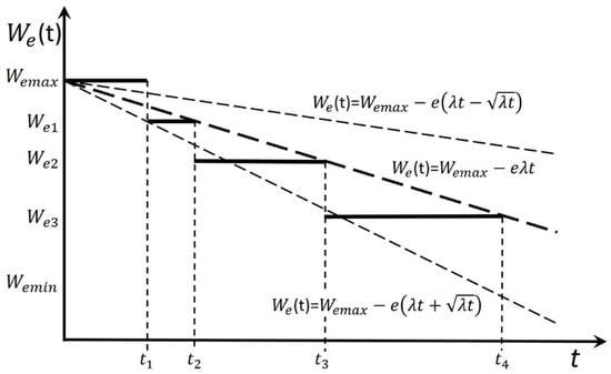 Using Poisson’s process, it is possible to present a physical interpretation of the process of reducing We using a fixed value of e [7]. Assuming that from the moment the engine starts operating (assuming that this is the moment ) until the moment when the measuring device registers for the first time, event A consisting of reducing the operation of We by a value of ΔWe = e, any value of We’s operation (including at the maximum load of the engine) can be performed in particular periods of the engine’s operation. As time passes, further wear and tear of the engine causes further drops in We’s operating value by another equal e value, recorded by the measuring device. Therefore, if the accumulated number of of events A, described by a homogeneous Poisson process, is recorded up to t, a total reduction of We by up to t, can be presented with the following relation: