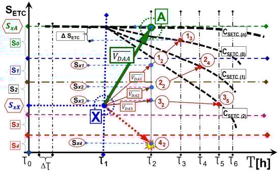 In addition to the processes that are a natural consequence of using the engine with different potential, it is important to note, for example, that the desire of users to perform a transportation task even/or especially when the potential of the engine’s technical condition is reduced, results in additional negative events that accelerate engine wear. An incorrect operating decision may cause the set of technical condition potential values of the engine, presented as the engine condition potential curve (wear and tear during operation), to decrease by an appropriate value (—state of technical condition of the engine). This phenomenon has been shown as the curve of the state of the engine technical condition, with , , , , and presented as consequences of adequate decisions, shown in Figure 6 as decision accuracy vector where i = {1, …, 6}.