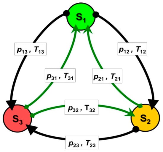 An important feature of the graph shown in Figure 9 is that the relationship between states reflecting the execution of full recovery to state is taken into account if the engine is in state or . Therefore, this variant of ∈ S condition means changes should be taken into account in creating a simpler (tri-state) graph to show the technical condition changes of a ship’s main engines and a related diagnostic model of this type of engine (Figure 10).