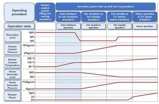 The first step of the cold shutdown operation is to heat the coolant in the primary system by turning on all the pressurizer heaters (e.g., back-up and proportional heaters) and starting the reactor coolant pump. This leads to an increase in the temperature of the primary system and pressure inside the pressurizer. The pressure of the primary system, that is, the reactor coolant system (RCS), should be maintained between 25 kg/cm2 and 29 kg/cm2 despite the increase in the pressurizer temperature. Thus, the increase in pressure can be prevented by opening a letdown valve that handles the letdown flow rate from the RCS to a residual heat removal system (RHR). When the pressurizer temperature reached the saturation point of approximately 200 °C, its level decreased. A space filled with saturated steam was created on top of the pressurizer, allowing pressure to be controlled through the pressurizer spray. Subsequently, the level inside the pressurizer was maintained at 50% by adjusting the charging flow rate. It is known that this operation normally requires 8 h for actual NPPs.