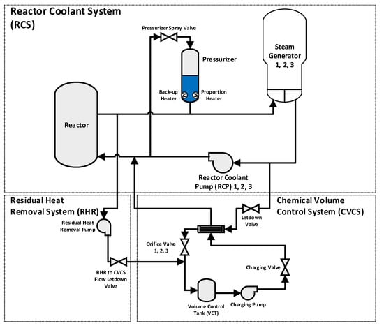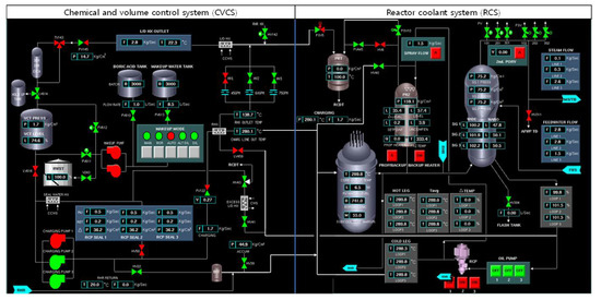 A compact nuclear simulator (CNS) was used as a real-time testbed to train and validate the developed DRL-based controller. The CNS was originally developed by the Korean Atomic Energy Research Institute (KAERI) with reference to a Westinghouse 930 MWe three-loop PWR [48]. Figure 10 shows the interface of the chemical and volume control system (CVCS) and reactor coolant system (RCS) in the CNS.