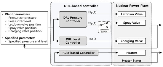 This section introduces the development of a DRL-based controller to create bubbles for the pressurizer and then controls the pressurizer pressure and level during the cold shutdown operation. The DRL-based controller comprises two DRL controllers and a rule-based controller, as shown in Figure 3. The rule-based controller performed the discrete controls listed in Table 4. As a result of the task analysis, if specific rules, that is, if–then logic, can be defined, the rule-based controller is applied, as shown in Table 4. Therefore, the back-up heaters and proportional heaters are controlled using a rule-based controller.