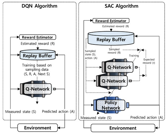 This study utilized SAC to improve the training stability of a DRL-based controller using an LSTM network model. The SAC was suggested to compensate for the deep Q-learning network (DQN), which is a basic model of the DRL. The drawback of the DQN is biased actions caused by predictions that rely on a single neural network. One network in the DQN predicts actions mixed with evaluations based on action probability and estimated reward. In contrast, SAC uses an actor-critic architecture with a separate value (Q-network) and policy network, as shown in Figure 4. Q-networks calculate the expected rewards for an action taken in the current state. Then, the policy network predicts each action probability based on the expected reward and the current state. For training stability, SAC uses two Q-networks consisting of an online network and a target network. The target network update is delayed when updating the online network parameters over many iterations [6]. While updating online network parameters over many iterations, the target network parameters perform delayed updates from the online network at regular intervals, which helps reduce biased training.