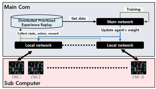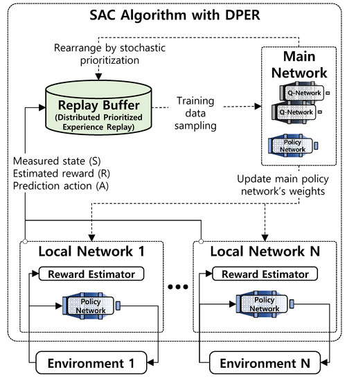 Moreover, to reduce the training time, this study also adopted a distributed training architecture with distributed prioritized experience replay (DPER), a type of experience replay buffer, as shown in Figure 5. In this architecture, the main network is trained with data collected from multiple simulations using a local neural network. Each local network contains only a policy network that regularly distributes training from the main policy network.