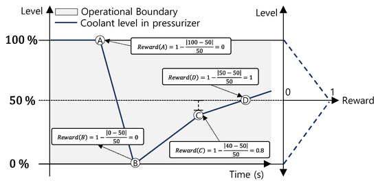 As the level controller does not operate until the saturation point is reached, the level-reward algorithm provides a reward when the level controller starts control. As shown in Figure 6, the reward value is defined as the difference between the current pressurizer level and desired level (50%), as shown in Equation (1). The pressure level in the pressurizer was varied between 0% and 100%. To provide a reward range between 0 and 1, the scaling value is defined as 50, which is the maximum distance from the desired pressurizer level to the limits of range (0% to 100%). For instance, the level reward is zero for the lowest reward when the current level is within the limits of the level range (Points A and B in Figure 6). As the current level increases from Point C to D, approaching the desired value, the level reward increases from 0.8 to 1. The level reward algorithm provides a maximum reward of one when the level controller is running successfully to maintain the current level at the desired pressure level: