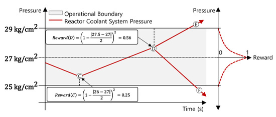 The pressure-reward algorithm provides a reward for the pressure controller to maintain a pressure between 25 kg/cm2 and 29 kg/cm2. The reward value was calculated as the difference between the current RCS pressure and the desired condition, as shown in Equation (2). The scale value is defined as 2, which is half the desired range of pressure. Because the pressure changes slightly during the cold shutdown operation, the pressure reward uses the squared reward to consider pressure changes sensitively. For instance, in Figure 7, the reward value at Point C is the difference between the current RCS pressure and the lower desired pressure (25 kg/cm2), which is 0.25 at the current pressure 26 kg/cm2. In the case of point D, that is, at a current pressure of 27.5 kg/cm2, the reward value is the difference between the current pressure and the upper desired pressure (29 kg/cm2), which is 0.56. Therefore, the pressure reward increased as the pressure approached the middle of the pressure boundary, with a maximum of 1. When the current pressure exits the desired pressure boundary, e.g., Point E and F in Figure 7, the training is terminated.