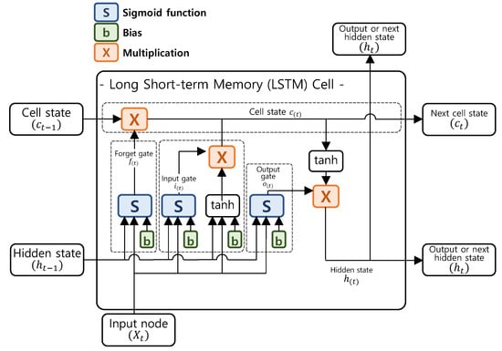 The structure of a typical LSTM cell consists of cell state and three gates, i.e., cell state, input, output, and forget gates, as shown in Figure 8 [47]. The cell state retains the prior state information across time steps. The input, forget, and output gates determine which prior cell state will be saved, dumped, and sent out in the next cell state, respectively. The output of the input gate (), forget gate (), output gate (), and cell state () are expressed as shown in Equations (3)–(6). Then, the hidden state ( is updated with Equation (7) and sent to the next cell:
