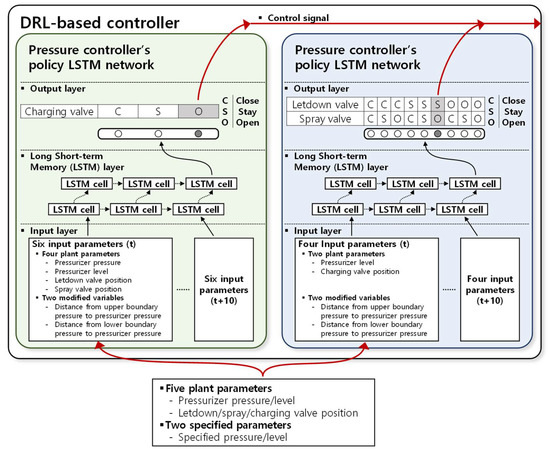 As shown in Figure 9, the proposed DRL controller includes two policy networks composed of LSTM networks to manage the pressurizer pressure and level. The DRL controller used five plant parameters and two specified pressures and levels. The plant parameters consisted of three component states (letdown/charging/spray valve positions) and two pressurizer states (pressure and level). The pressure policy network uses four plant parameters (pressurizer pressure, pressurizer level, letdown valve position, and spray valve position) and two modified variables that include the distance from the pressure boundary. The level-policy network uses two plant parameters (pressurizer level and charging valve position) and two distance values from the specified level.