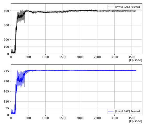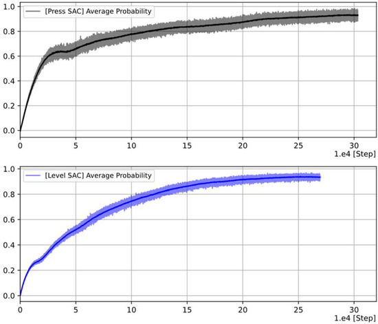 To achieve acceptable performance of the proposed DRL-based controller, it was trained until it reached a stable training state. DRL-based pressure and level controllers are trained through many episodes, each of which is completed if at least one controller reaches the termination condition. All controllers stop training when the average maximum probability converges to a certain value, or when the value stabilizes. The average maximum probability is the mean value of the probability of the actions selected by the DRL controller in one step. In one step, the DRL-based controller learns using 256 sample data from the DPER. In this study, the experimental results considering the entire operation time confirmed that operational goals could be reached when 256 data points were sampled. If there are more (512) or less (128) than this, learning fails. The average maximum probability refers to the degree to which the DRL controller completes the training. If the average maximum probability is higher than the previous step, it implies that the DRL controller selects actions that are more likely to succeed. Figure 12 shows the trend of the average maximum probability per step over time. Figure 13 shows the trend in the rewards per episode. The y-axis represents the total reward earned in each episode.