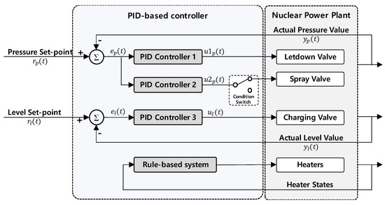 A PID-based controller was designed as shown in Figure 14. The PID-based controller should manage five components (charging, letdown, spray valves, and back-up and proportional heaters) to achieve two operational goals (pressurizer pressure and level). If-then logic was applied to control the two heaters. Therefore, three PID controllers are developed for the three valves.