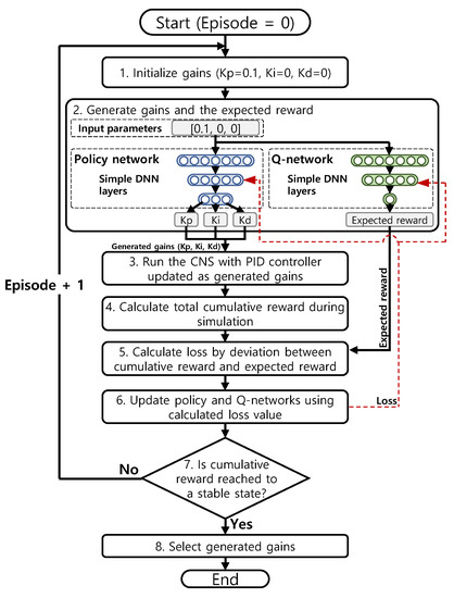 Typical approaches to automatic controllers in current NPPs include proportional-integral-differential (PID) controllers, programmable logic controllers (PLCs), and field-programmable gate arrays (FPGAs) [6,7,8,9]. For safety systems, the PLC is generally used to automatically act as a fast and reliable response to prevent malfunctions from propagating into major accidents. For non-safety systems, PID controllers or controllers that combine two out of three types of controllers (e.g., proportional-integral controllers) are the most popular among the existing NPPs. These controllers generally aim to stabilize a system within a defined range.