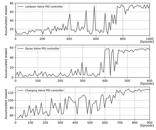 The pressure and level controllers reached a stable value after 2000 episodes. Approximately 84 h of training were required until the DRL-based controllers learned how to adjust the charging, letdown, and spray valves to achieve the operational goal. At approximately 500 episodes, the rewards reached 400 (pressure controller) and 275 (level controller).