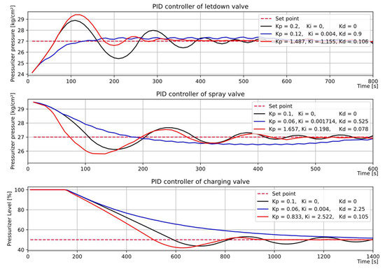 In general, a PID controller is applied to a single-input, single-output system without considering the disturbance and nonlinearity of the system [49]. Thus, three PID controllers must be developed to adjust the charging, letdown, and spray valves. In Figure 14, PID Controllers 1 and 2 adjust the letdown and spray valves for pressurizer pressure, whereas PID Controller 3 manages the charging valve at the pressurizer level. Because the spray valve can be operated after pressurizer bubble creation, a condition switch was added to avoid unnecessary operations. The operational goal of PID controllers 1 and 2 was to regulate the pressurizer pressure within a specified pressure (). The pressure deviation error () between the actual pressure value () and pressure set-point () is commonly used in PID controllers 1 and 2. PID controller 3 controls the charging valve to satisfy the pressurizer level.