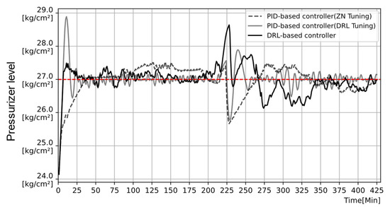 Table 7 compares the DRL- and PID-based controllers in terms of the average deviation error from the target value of the parameters and the time taken to reach the target value. For the pressurizer pressure and level, the DRL-tuned PID controller generally exhibited the smallest error and fastest reaching time than both the ZN-tuned PID controller and the DRL-based controller.