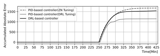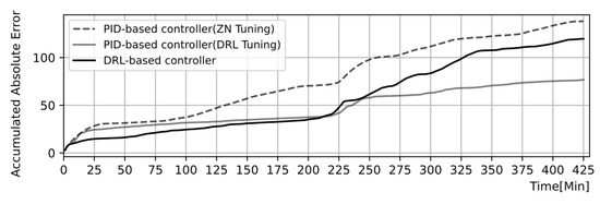 Figure 25 shows a comparison of the number of manipulations for the three components. As shown in the figure, PID-based controllers control the components more frequently than DRL-based controllers. This may be related to the second finding described above. DRL-based controllers work interactively and can satisfy the operational goal with fewer manipulations.