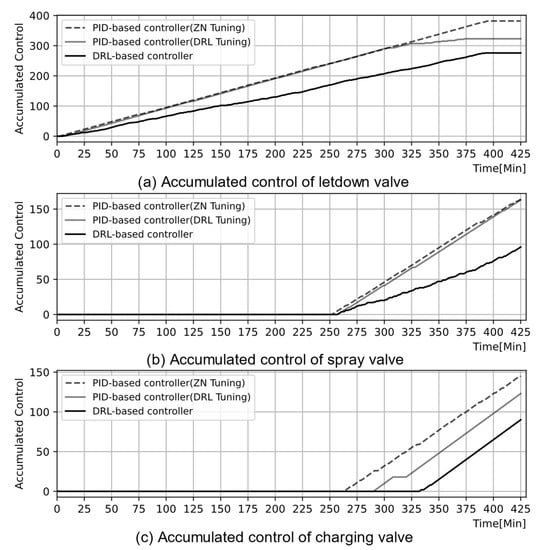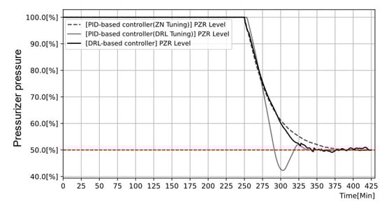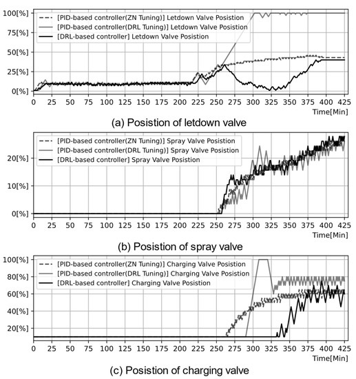 To control the pressurizer pressure to the desired value, three PID-based controllers were designed for three components: the charging valve, letdown valve, and spray. The controllers opened these values and the spray simultaneously to reduce pressure, as shown in Figure 24. On the other hand, two DRL-based controllers were developed for the control of pressure, not the control of components. Thus, the DRL-based controllers manipulate the three components in an interactive manner. For instance, as shown in Figure 24, the DRL-based controllers closed the letdown value at approximately 260 min and instead maintained the charging valve closed, while the PID-based controllers consistently opened these valves at the same time.