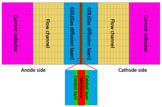 Table 1. The PEMFC is composed of an anode flow channel, anode diffusion layer, MEA, cathode diffusion layer, and cathode flow channel, as shown in