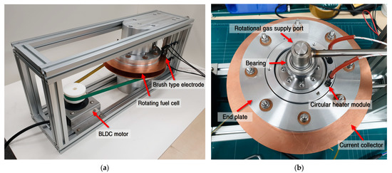 Figure 9c, as the load increased, the product inside substantially increased, which led to a sudden decrease in the current during 100–400 s, and afterwards. Subsequently, the overall current generation was reduced owing to the irregular changes in the current density and stagnation of the product. For flooding due to stagnation of the product, the results from the water drainage acceleration experiment using the rotational PEMFC shown in