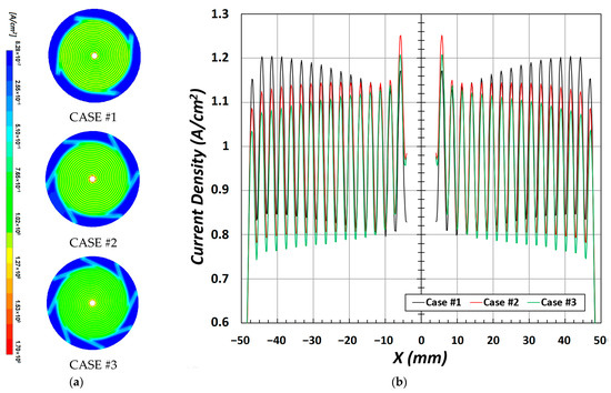 Figure 5a. Notably, all three types of flow channels (CASE #1, CASE #2, and CASE #3) have similar trends in the current density distribution, but show a high current density in the rib area. Particularly, in CASE #1, as shown in