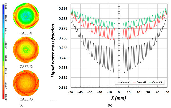 Figure 6b, the mass fraction of water increases at the CL/GDL interface when the water is near the outlet. As previously mentioned, this is directly related to the internal pressure developed in the channel. According to the shape of each channel, a low fraction of water was observed at the central part, where the pressure was high, whereas the fraction increased near the outlet as the pressure decreased. Furthermore, the strength of under-rib convection changed depending on the internal pressure, which caused a difference in the water mass fraction; thus, the channel section had a higher value than that of the rib section.