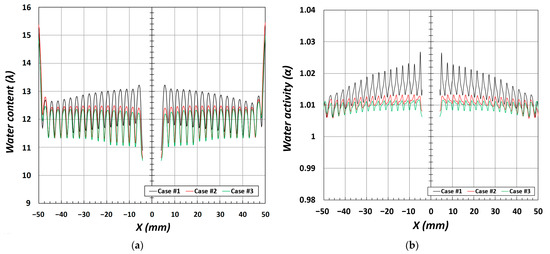 Figure 7a. However, in the case of the four-channel design, the water content and water activity of the membrane increased as the flow was irregular owing to the high pressure and complex shapes of the flow channels, leading to a local increase in the electrochemical reaction. In addition, CASE #2 and CASE #3 had similar values because of the flow distribution of the reactant gases and low internal pressure compared with CASE #1. The increase in water activity in
