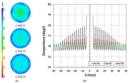 In CASE #1, owing to the high pressure and complex channel shape, the flow is irregular, and, thus, the electrochemical reaction increases locally, considerably increasing the water content and water activity. In addition, CASE #2 and CASE #3 have similar values compared to those in CASE #1. An increase in water activity indicates that the local current density is enhanced as the ionic conductivity increases, and, simultaneously, the temperature increases with the heat of reaction. In particular, the temperature was low at the rib and high in the channel.