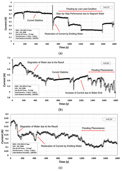 Figure 9a, the water production and drainage were stabilized until 700 s owing to the low loading, but stepwise current changes occurred at 700–1600 s. This was reduced as flooding occurred because the product from the electrochemical reaction accumulated within the channel over a longer experimental time. In addition, at 0.6 V, as shown in