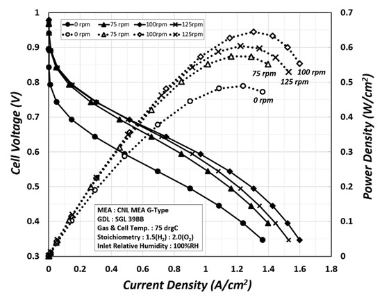 Figure 10. In particular, from 0 rpm to 100 rpm, the performance improved owing to water drainage, but at 125 rpm, the performance was reduced as the entire water produced in the cell was completely drained by the strong centrifugal force.