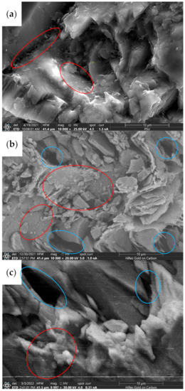 SEM of samples: (a) IEKEV2517, (b) IEKEV5602, (c) IEKEV5601. Red ovals show the places of colloids and small particles accumulation. Blue ovals show large visible pores.