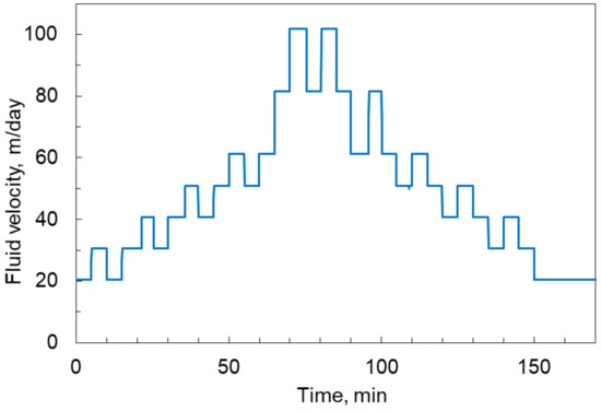 As numerous studies have shown [24,31,33,35,36,37,58], a change in the injection rate leads to the release of colloids, which can be located on the walls of the pores, strained at pore throats, bridge clogged, or lying in stagnant zones. The release of colloids is indicated by a change in the concentration of colloids in effluents washed out of the porous medium, a change in the geometry of the pore space, and a change in hydraulic conductivity—permeability. In our case, we judge the migration of colloids by the decrease in the permeability of the samples during the injection of a clean fluid.