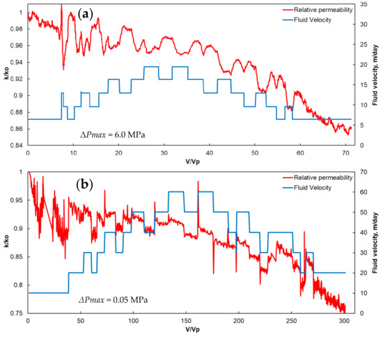 For sample IEKEV5602, the largest decrease in permeability was observed—up to 50%, from 10 to 5 mD. Significant degradation of permeability occurs at the beginning of the injection cycle, then the change in permeability stabilizes and becomes almost linear (Figure 4c). The pressure drop through the sample was 0.35 MPa and no stepwise change in permeability was observed, and along with the change in fluid velocity, the slope of the permeability curve also changed. At high fluid velocities, the permeability decreases more slowly than at low velocities (Figure 5). This suggests that at high fluid velocities, mobilization and entrainment of colloids prevail over retention. It can also be argued that the decrease in permeability in sample IEKEV5602 is not a consequence of bridging, but is due to the attachment of colloids to the pore walls. The absence of a bridging mechanism can also be associated with a large pore size in relation to the size of colloids and their low concentration [64].